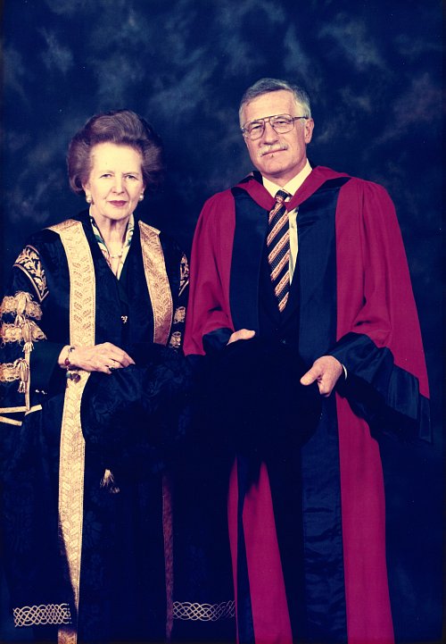 Z bohaté galerie společných fotografií Margaret Thatcherové a Václava Klause, dvou významných státníků, kteří k sobě měli blízko politicky i lidsky a často se v průběhu svých politických kariér setkávali, jsme vybrali fotografii ze slavnosti udělení čestného doktorátu Václavu Klausovi Univerzitou v Buckinghamu, při jehož příležitosti pronesla Margaret Thatcherová laudatio.